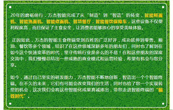從面粉到鮮面條只需8秒,深受廣大老百姓好評,如今已經(jīng)進入零售、餐飲等多個領(lǐng)域。零售方面,胖東來、北國商城旗下超市已成功進入,其他品牌超市正在接洽中;餐飲方面,長春、許昌、鄭州近40家餐飲已經(jīng)入駐?梢钥吹剑粋清晰的商業(yè)模式正逐漸形成。 從面粉到鮮面條只需48秒,完全實現(xiàn)自助點餐、掃碼付款,已成為終極版“無人面館”。它代表著業(yè)界最頂尖的智能主食終端技術(shù),各種應(yīng)用場景正在驗證中,已初見端倪。 一人操作供n人吃面,提升效率的同時節(jié)省人工,非常適合大型食堂和餐飲。 這是一間易操作、低成本、高坪效的“無后廚”餐廳,有可能顛覆餐飲產(chǎn)業(yè)。 搜索 復(fù)制 |