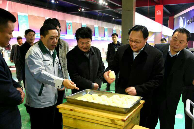 許昌市統戰部部長劉保新與襄城縣縣長李成一行在董事長王曉杰陪同下參觀公司展廳,詳細了解了公司的產品機構和企業文化,特別是在公司展廳了解到高端制面機項目的總體規劃和發展成績后對萬杰智能的發展表示高度贊揚。